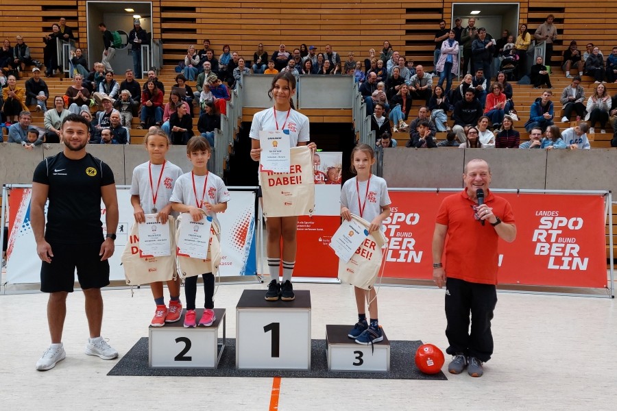 Ein besonderer Höhepunkt folgte am Ende: In den Disziplinen Leichtathletik (20m-Sprint) und Basketball (Schnelligkeitstest) wurden die besten Kinder geehrt. Sie durften sich über Medaillen und einen LSB-Sportbeutel freuen. Doch an diesem Tag waren alle Kinder Sieger – jedes Kind erhielt eine Teilnahmeurkunde sowie ein T‑Shirt von BERLIN HAT TALENT. Mit dem gemeinsamen Ohrwurm „Ein Hoch auf uns“ verabschiedeten wir die Kinder aus der Halle.